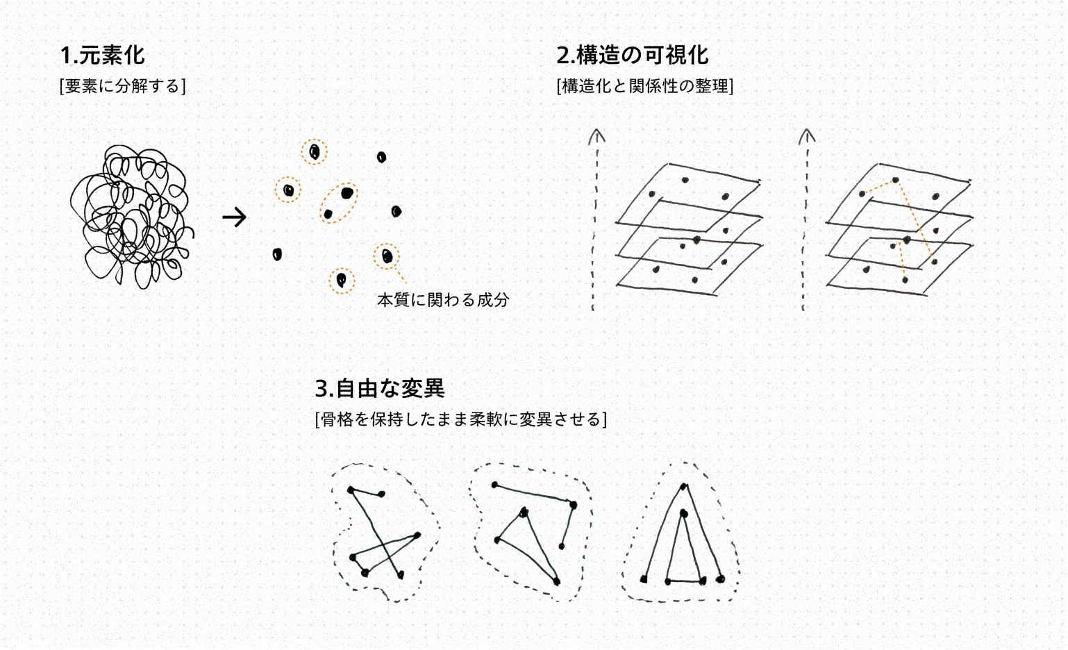 1.元素化:ごちゃごちゃした対象を一度ほどき、何が効いているのかを成分レベルで捉える。